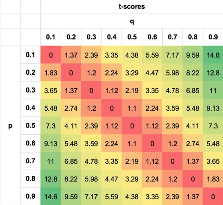 The first shows the asymmetry of the EV for different pairs p, q. The second shows t-score symmetry. The second shows the symmetry of the t-scores. I have shown the absolute t-scores (removing the negative sign for negative EVs when q < p) for clarity. Not only is a p, q pair of 0.3/0.7 just as likely as a 0.7/0.3 pair, but so are pairs such as 0.7/0.5 and 0.3/0.1, 0.8/0.7 and 0.2/0.1 for the reasons described above.