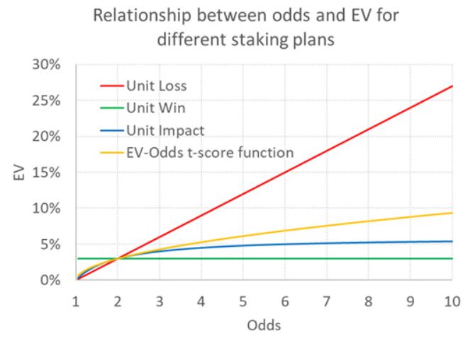 The authors have analysed the betting picks database of a well-known prediction site and believe they have confirmed that the relationship between EV and the odds implied by the unit impact bet best reflects the observed and expected returns of the tipsters (the latter being based on closing prices). I am still not convinced. I repeat, the unit impact method will only ever produce an EV that is at most double the EV for odds = 2.00. Is there a better alternative?