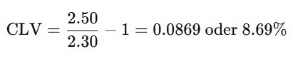 - Positiver CLV: Wenn Ihre anfängliche Quote höher ist als die Schlussquote (2.50 > 2.30), haben Sie einen positiven CLV.