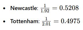 Für die Quoten von 1.92 für Newcastle (Draw No Bet) und 2.01 für Tottenham (Draw No Bet) erhalten wir folgende Wahrscheinlichkeiten: