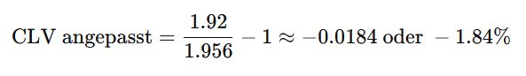 2. Der an die Marge angepasste CLV beträgt -1.84%, was bedeutet, dass, obwohl die Rohquoten gleich sind, die Wette nach Anpassung der Buchmarge einen leichten Wertverlust aufweist.