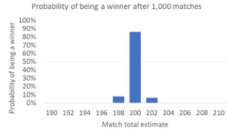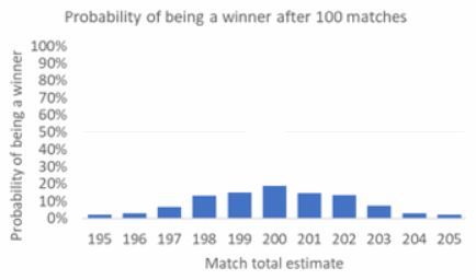 On average when the bookmakers quote a line of 190, 200 or 210, the match finishes with 190, 200 or 210 points respectively. Yes, there is a random variance in the results, and as already reported, it’s considerable. Nearly a third of games quoted with a 200-point line actually finish with fewer than 182 points or over 218 points.
