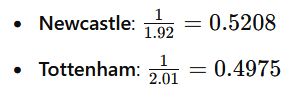 For the odds of 1.92 for Newcastle (Draw No Bet) and 2.01 for Tottenham (Draw No Bet), we get the following probabilities: