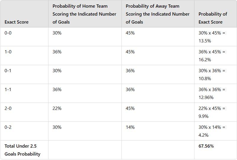 Since we know the individual probabilities for each score combination leading to under 2.5 goals, we can add them up to get the total probability of the match ending under 2.5 goals, thus ensuring a winning bet. In this example, it calculates as follows: