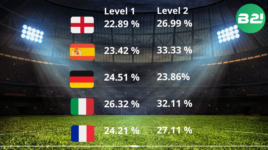 Na época 2022/23, vejamos o que aconteceu, em termos de empates, nas 5 principais ligas europeias da 1ª Divisão (Level 1) e da 2ª Divisão (Level 2)
