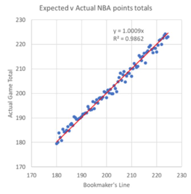 Em média, quando as casas de apostas cotam uma linha de 190, 200 ou 210, a partida termina com 190, 200 ou 210 pontos, respectivamente. Sim, há uma variação aleatória nos resultados e, conforme já relatado, ela é considerável. Quase um terço dos jogos cotados com uma linha de 200 pontos na verdade termina com menos de 182 pontos ou mais de 218 pontos.