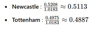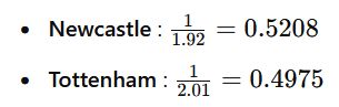 Pour les cotes de 1.92 pour Newcastle (Draw No Bet) et 2.01 pour Tottenham (Draw No Bet), nous avons les probabilités suivantes :